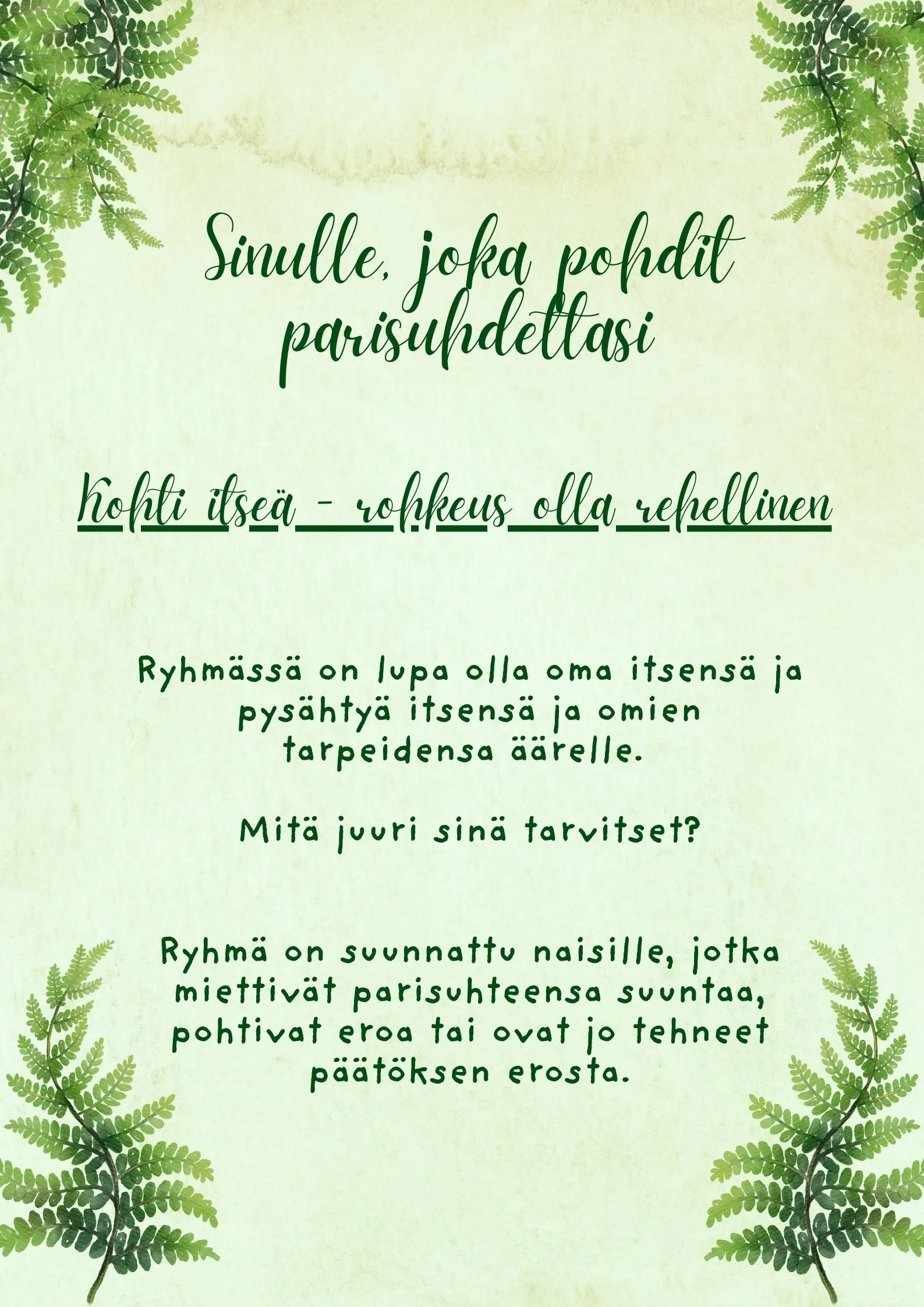 Ilmoittaudu mukaan jos tämä tuntuu siltä mitä juuri sinä nyt tarvitset. Ryhmä on avoin kaikille naisille, asuinpaikasta riippumatta. Ryhmä toteutuu, kun osallistujia ilmoittautuu kahdeksan, maksimi osallistujamäärä on 12.